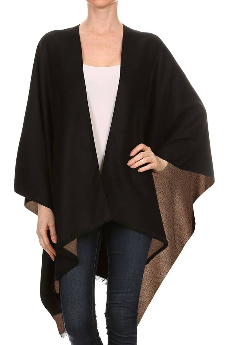 Elevate your layering game with this luxuriously soft reversible cape poncho, crafted from sumptuous 100% viscose that mimics premium cashmere. Featuring a sophisticated open silhouette with dramatic bat wing sleeves and delicate fray trim detailing, this versatile piece transitions seamlessly from day to evening. The solid-on-black reversible design offers two distinct looks in one statement piece, while the generous 63" x 47.25" dimensions provide effortless draping and movement. Perfect for adding an instant touch of elegance to any outfit, this modern poncho combines comfort with undeniable style.