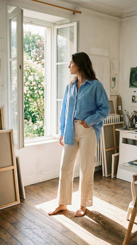 Bayeas Embroidery Wide Leg Jeans Off White