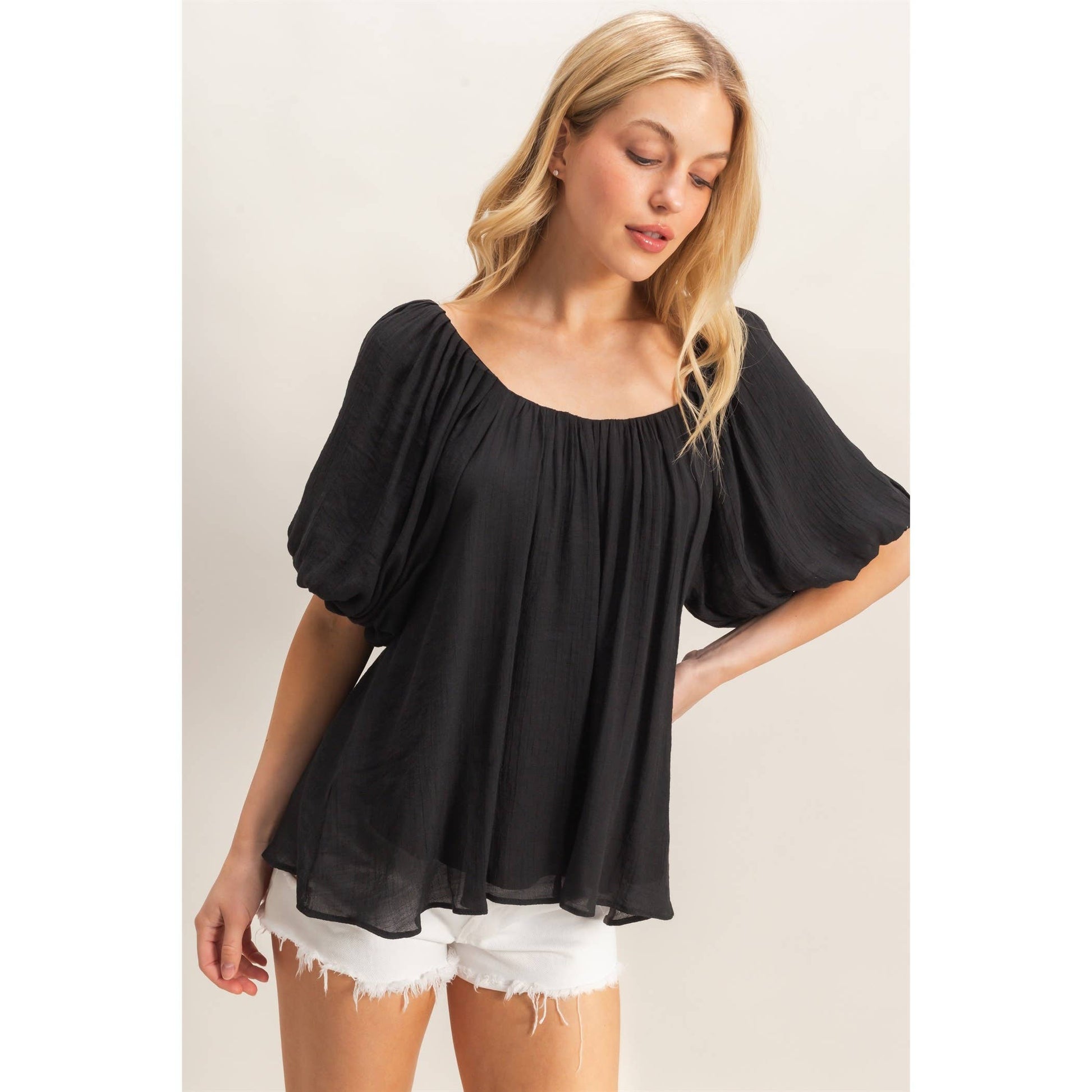 This elegant gathered blouse features a wide scoop neckline and relaxed puff sleeves, offering a flowy silhouette that's perfect for warmer climates. The breathable design pairs well with tailored shorts or a sleek pencil skirt, ensuring versatility in styling for various occasions and looks.